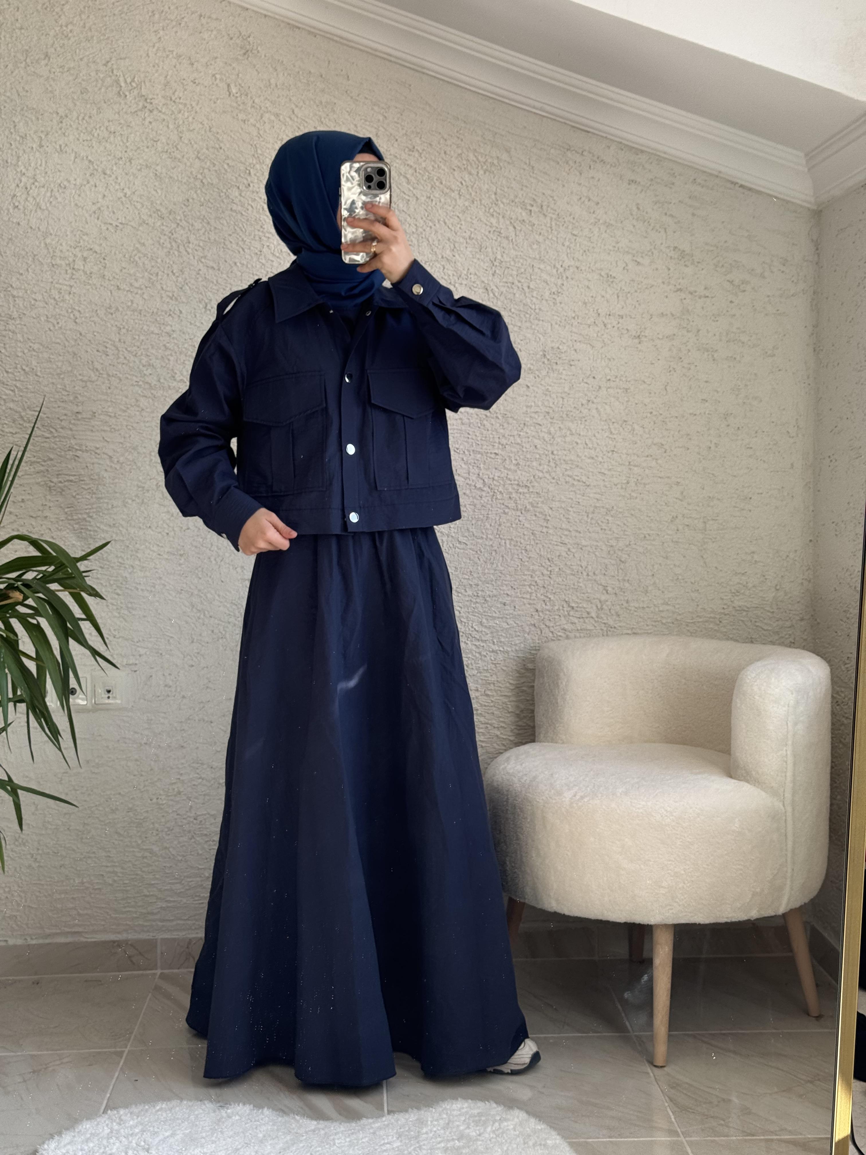 YAN DÜĞME DETAYLI MERSERİZE ETEKLİ TAKIM LACİVERT