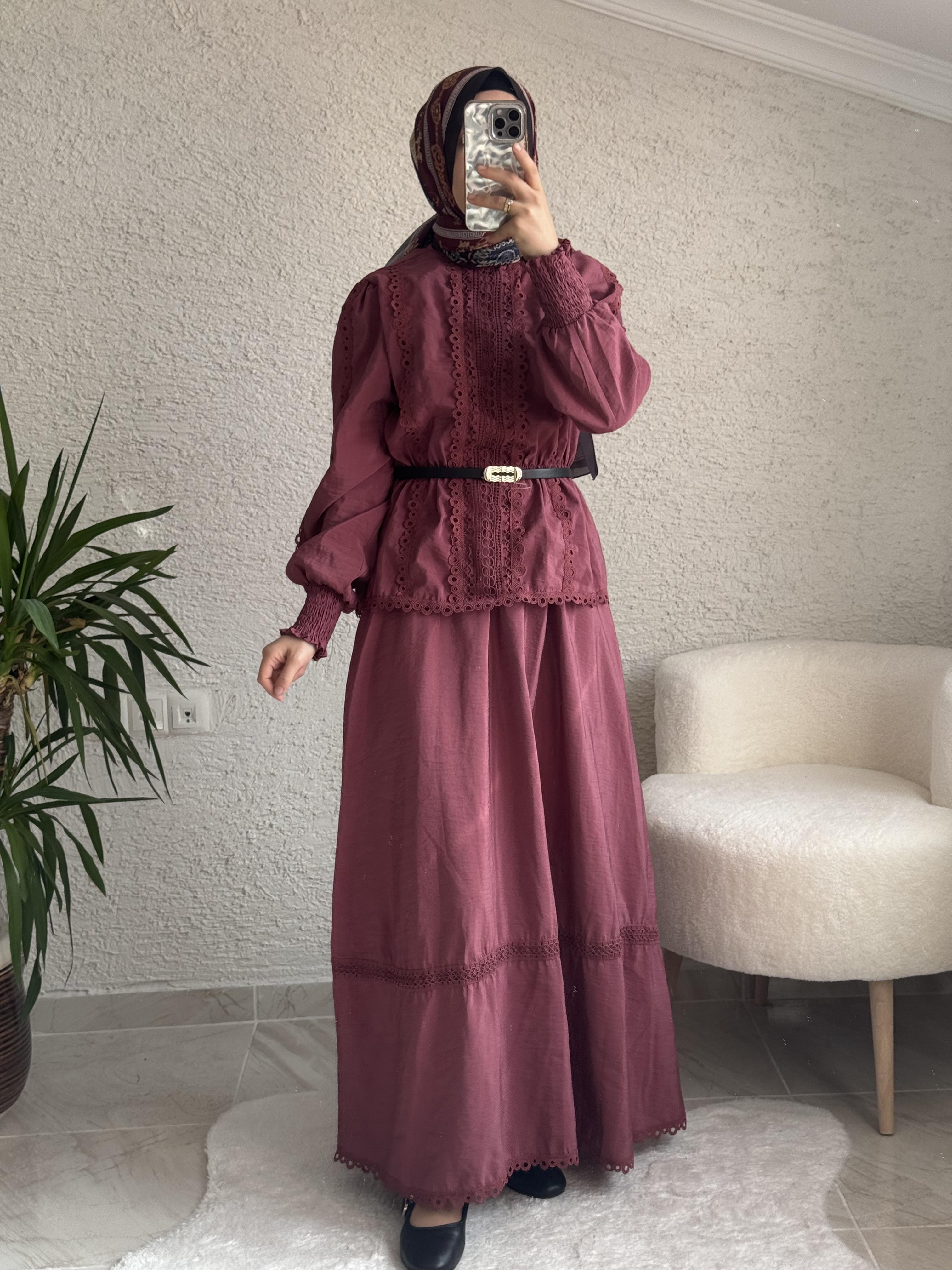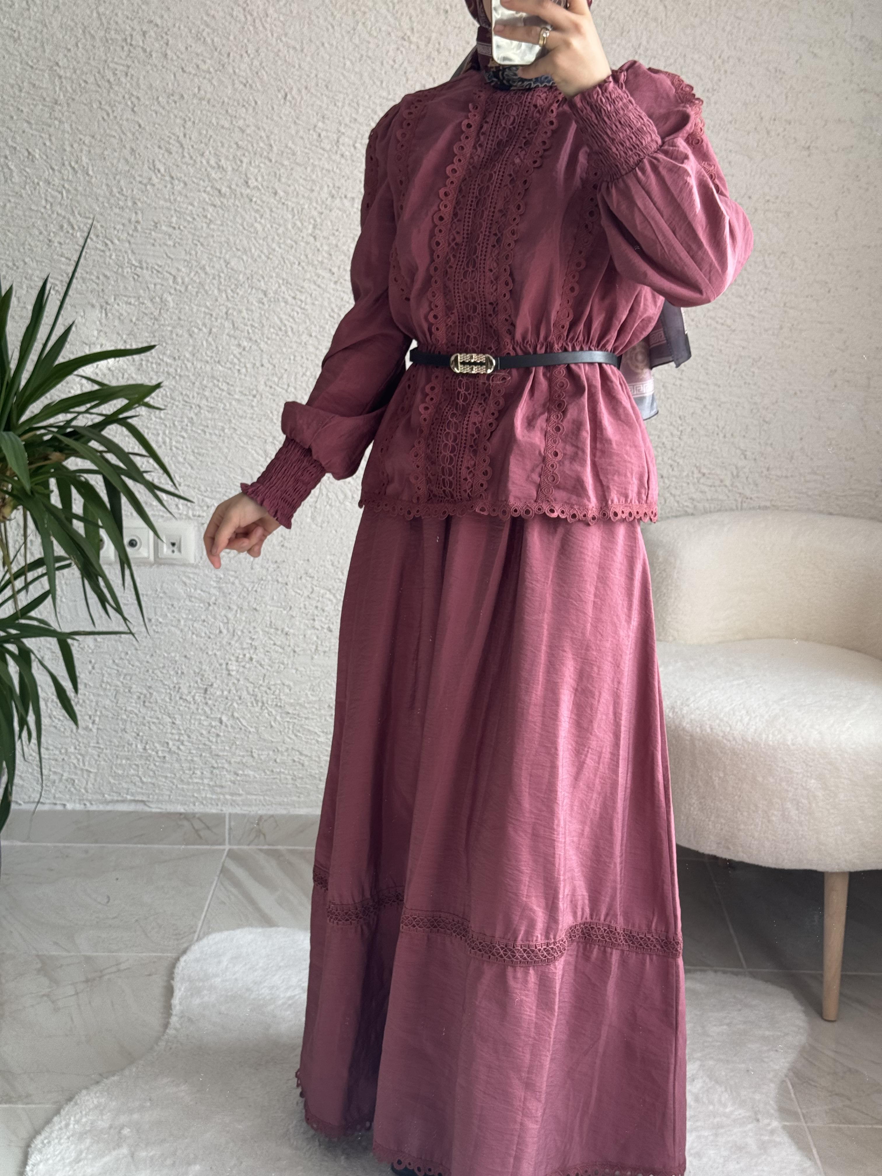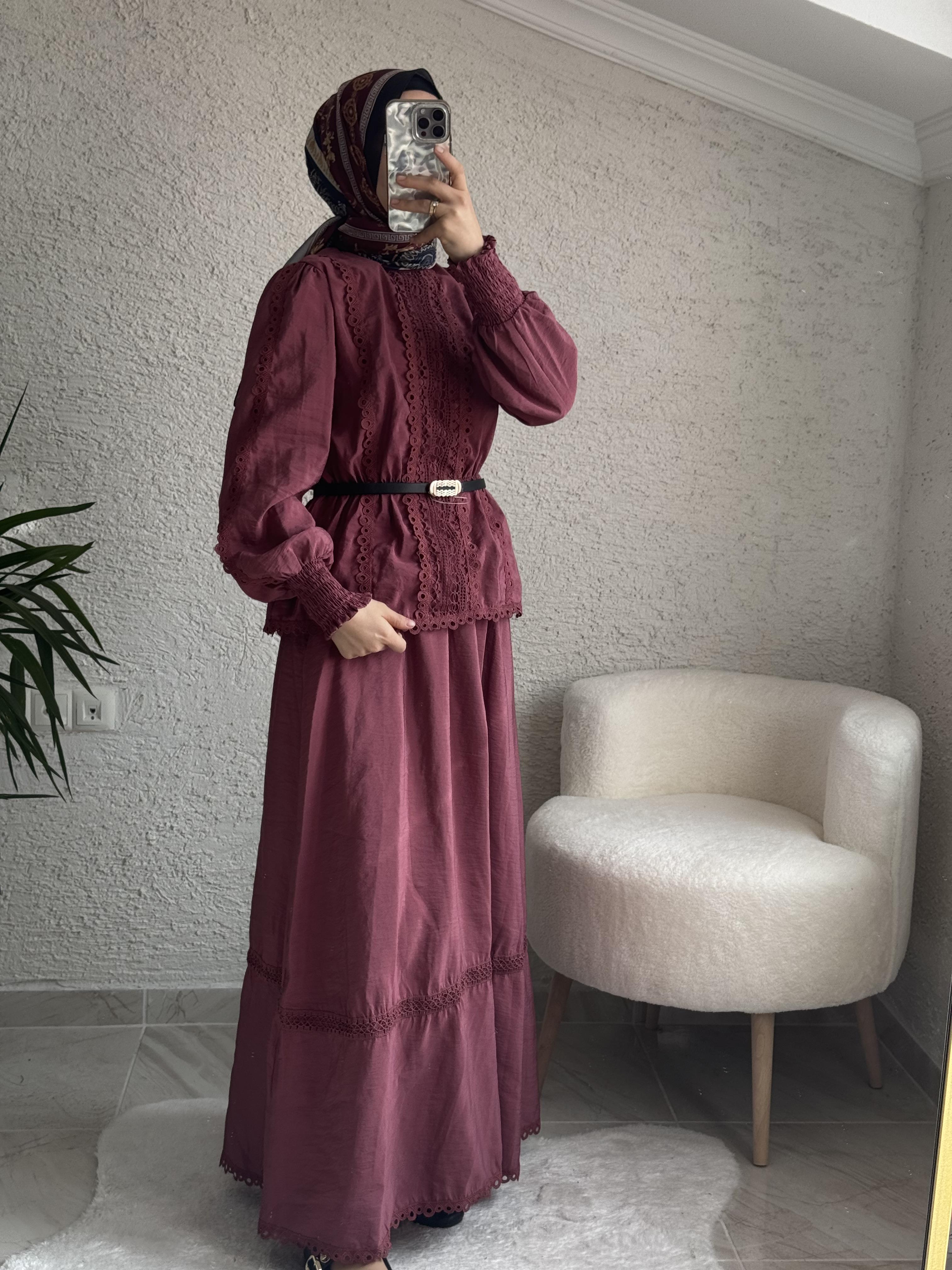 Takım Cupra kumaştan üretilmiştir. Bluz güpür detaylıdır, bluzun arka kısmı fermuarlıdır. Beli büzgülüdür, kolu lastik büzgülüdür. Eteğin arka kısmı lastiklidir, yandan fermuarlıdır. Eteğin cepleri bulunmaktadır. eteğin alt kısmında güpür detayı mevcuttur. Deri kemerlidir