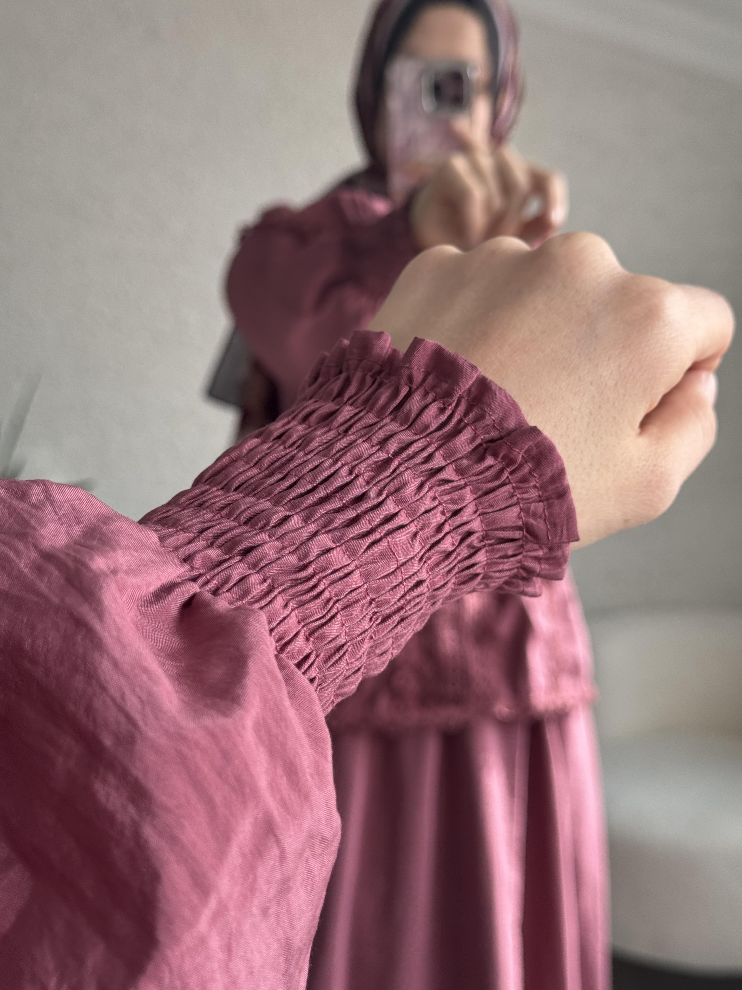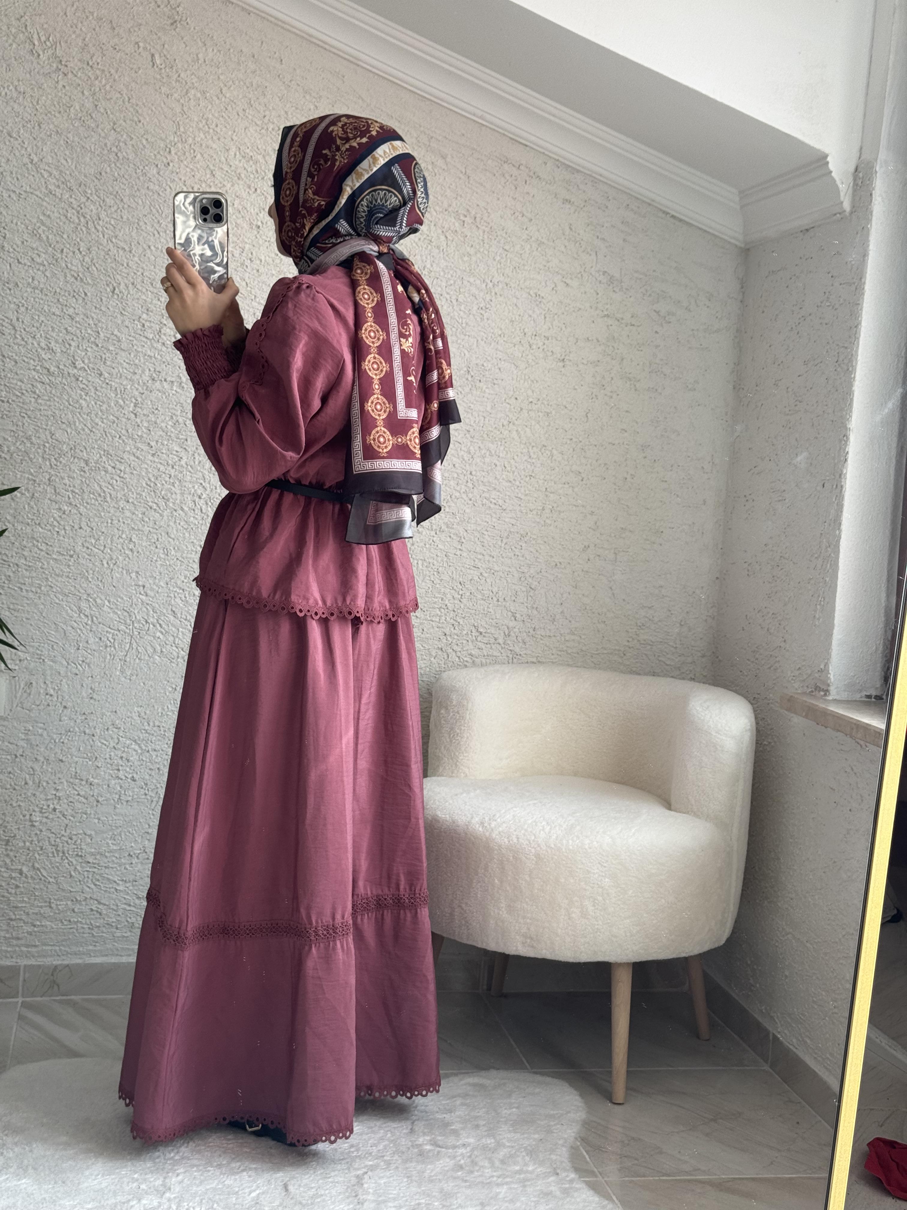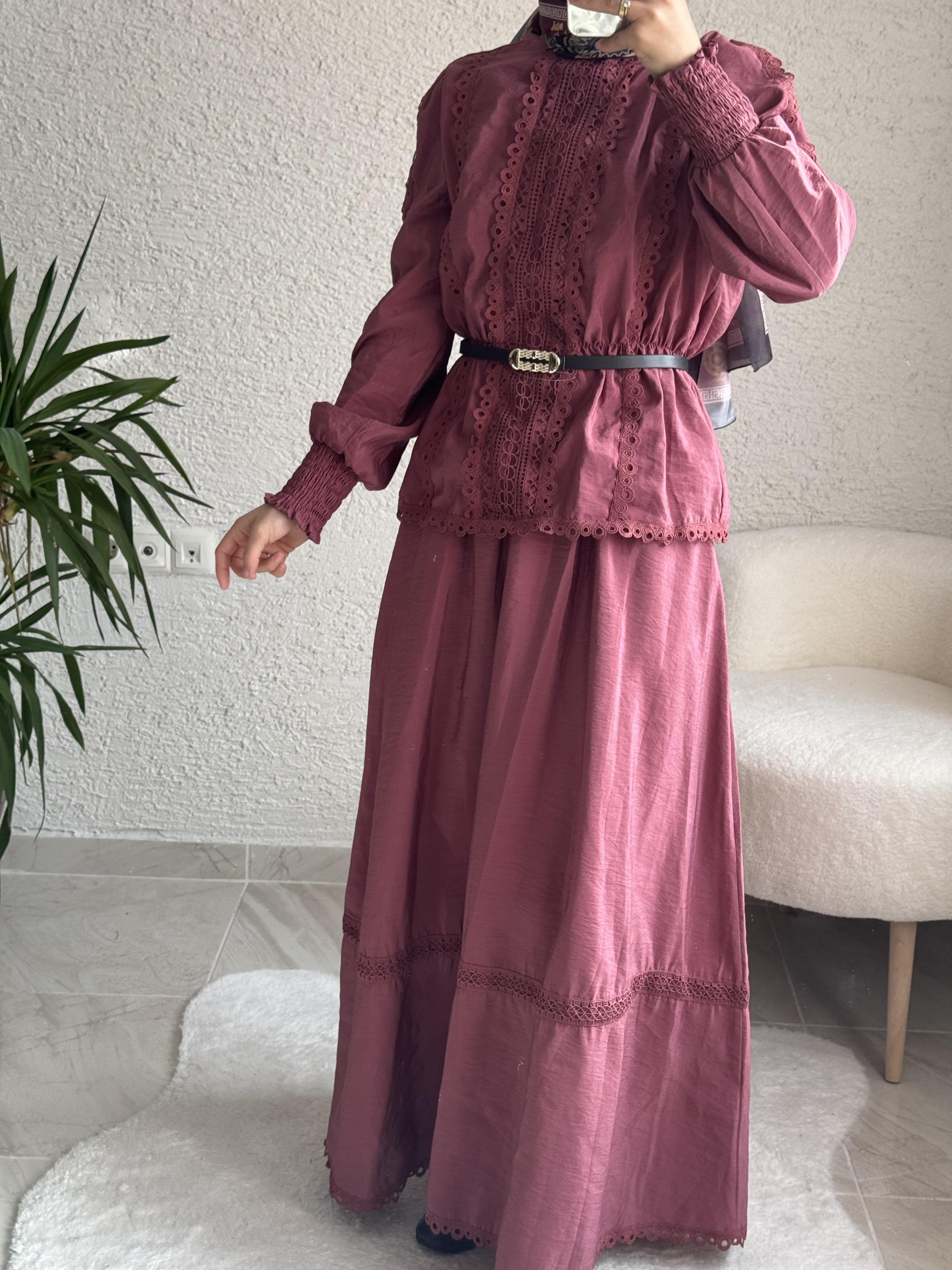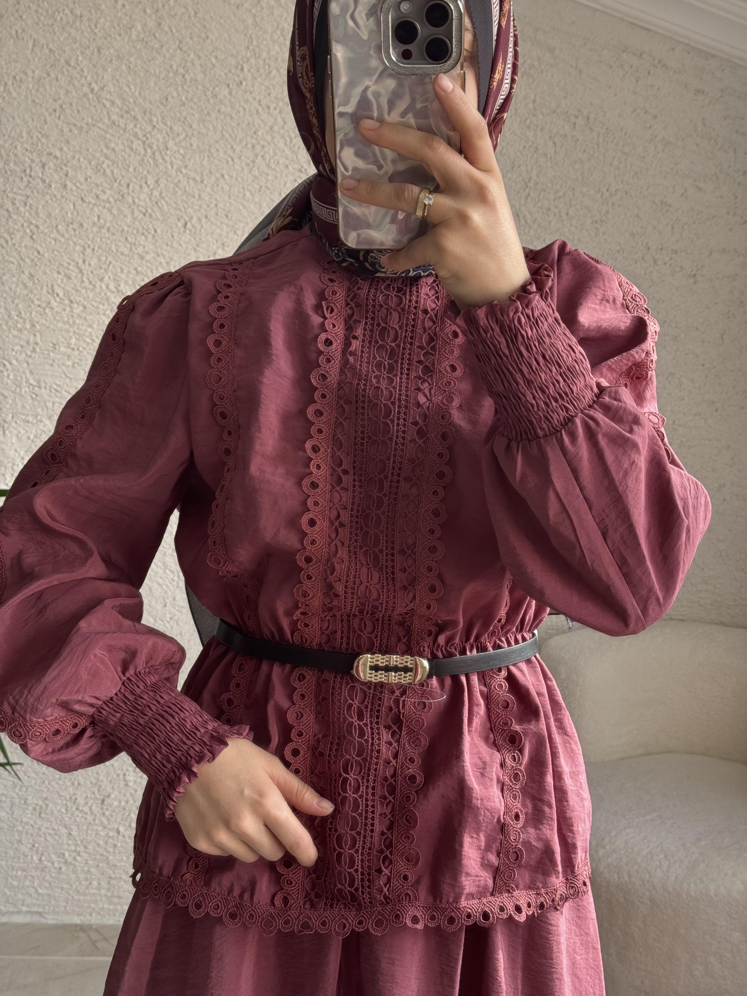 Takım Cupra kumaştan üretilmiştir. Bluz güpür detaylıdır, bluzun arka kısmı fermuarlıdır. Beli büzgülüdür, kolu lastik büzgülüdür. Eteğin arka kısmı lastiklidir, yandan fermuarlıdır. Eteğin cepleri bulunmaktadır. eteğin alt kısmında güpür detayı mevcuttur. Deri kemerlidir