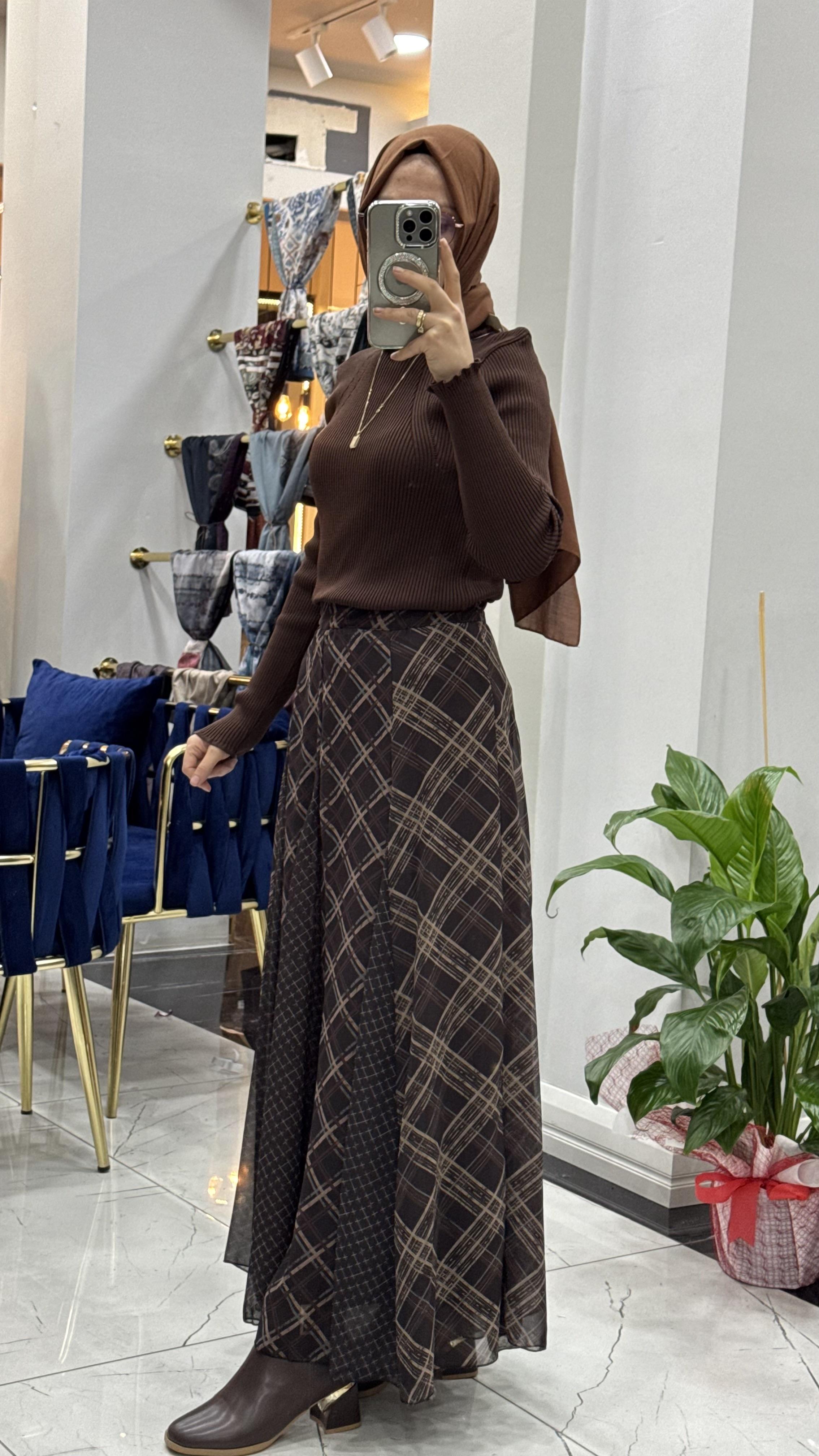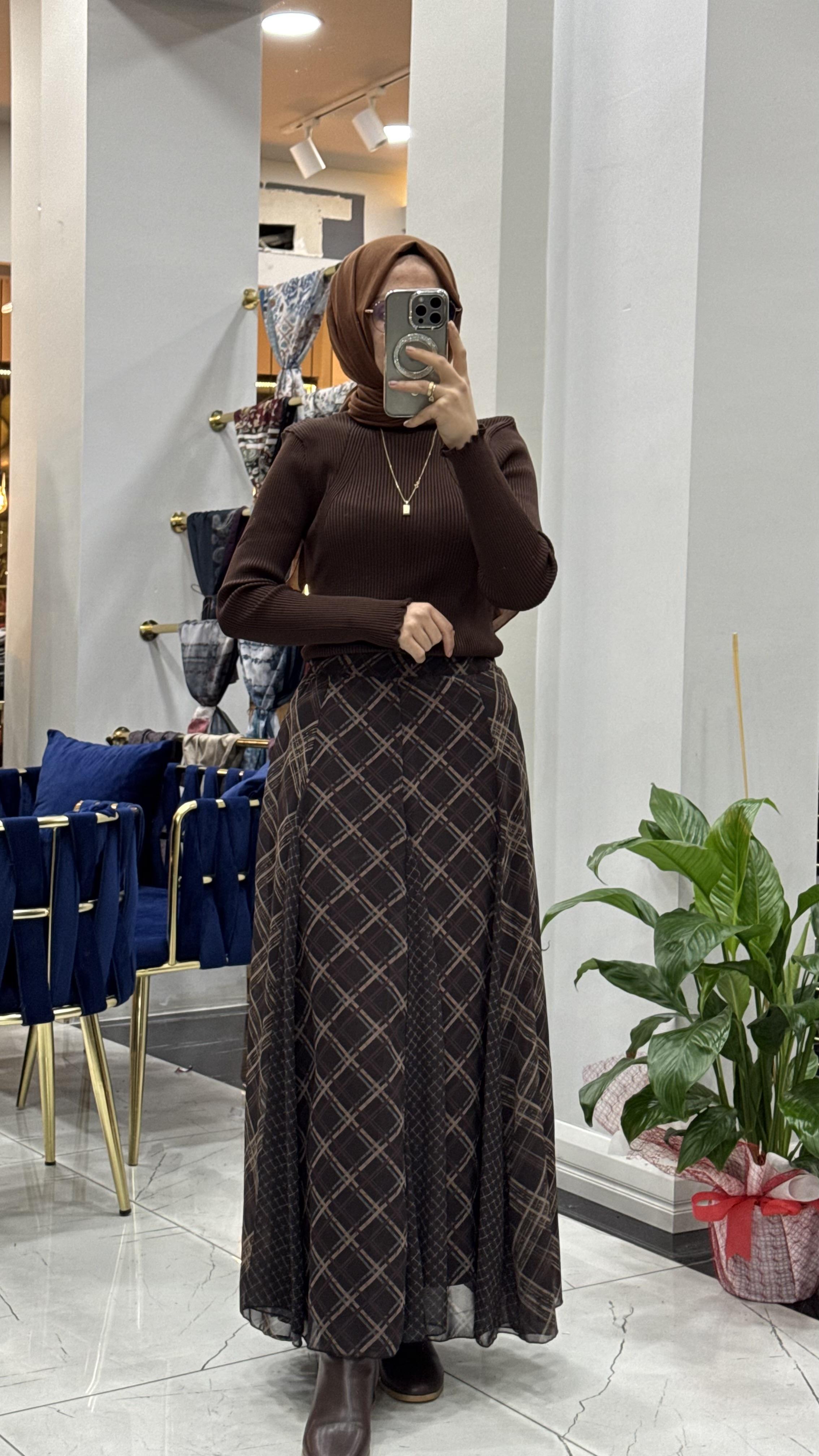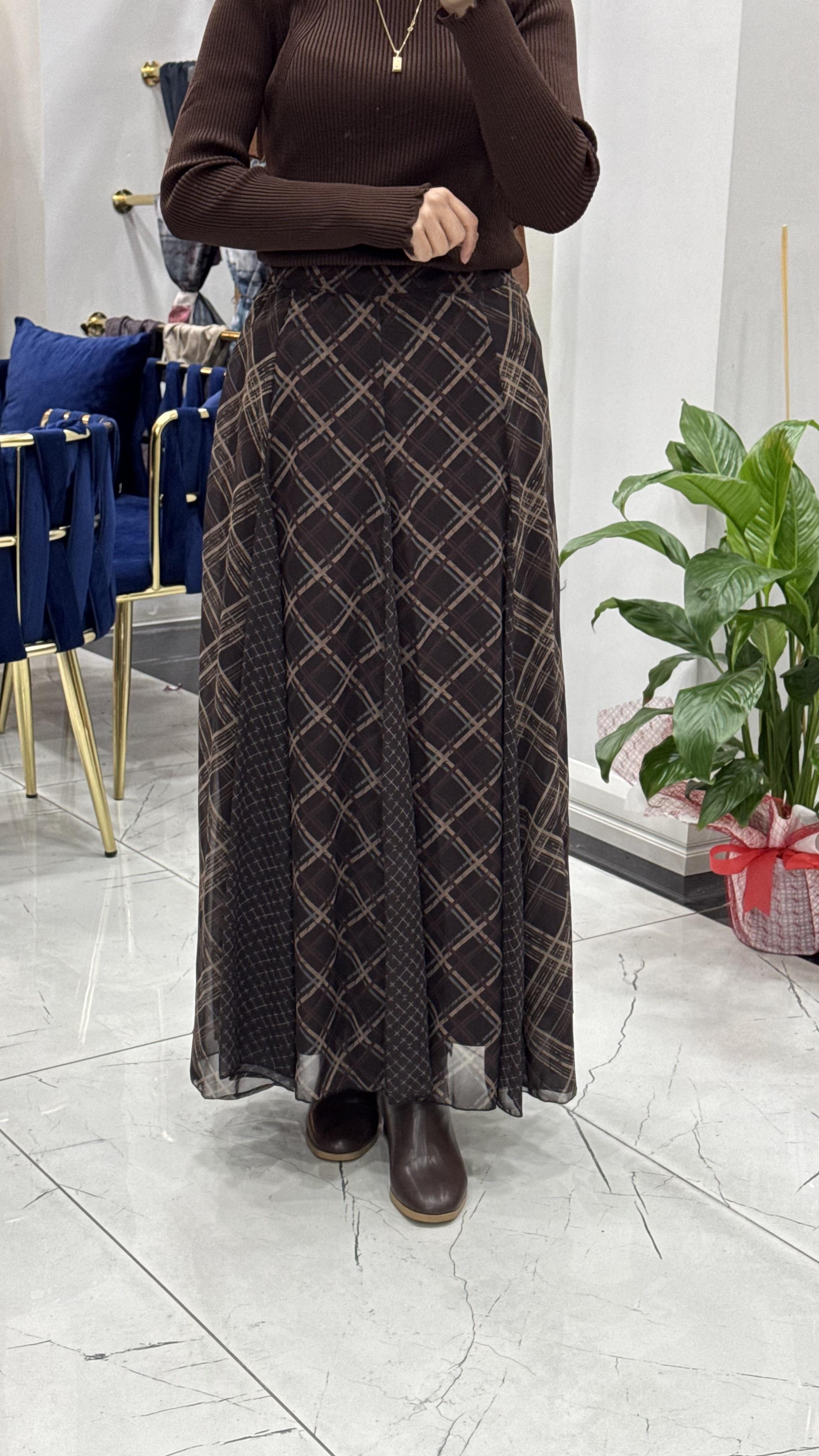 Ekose desenli etek, şifon kumaşı ve astarlı yapısıyla hafif ve akışkan bir duruş sunar.