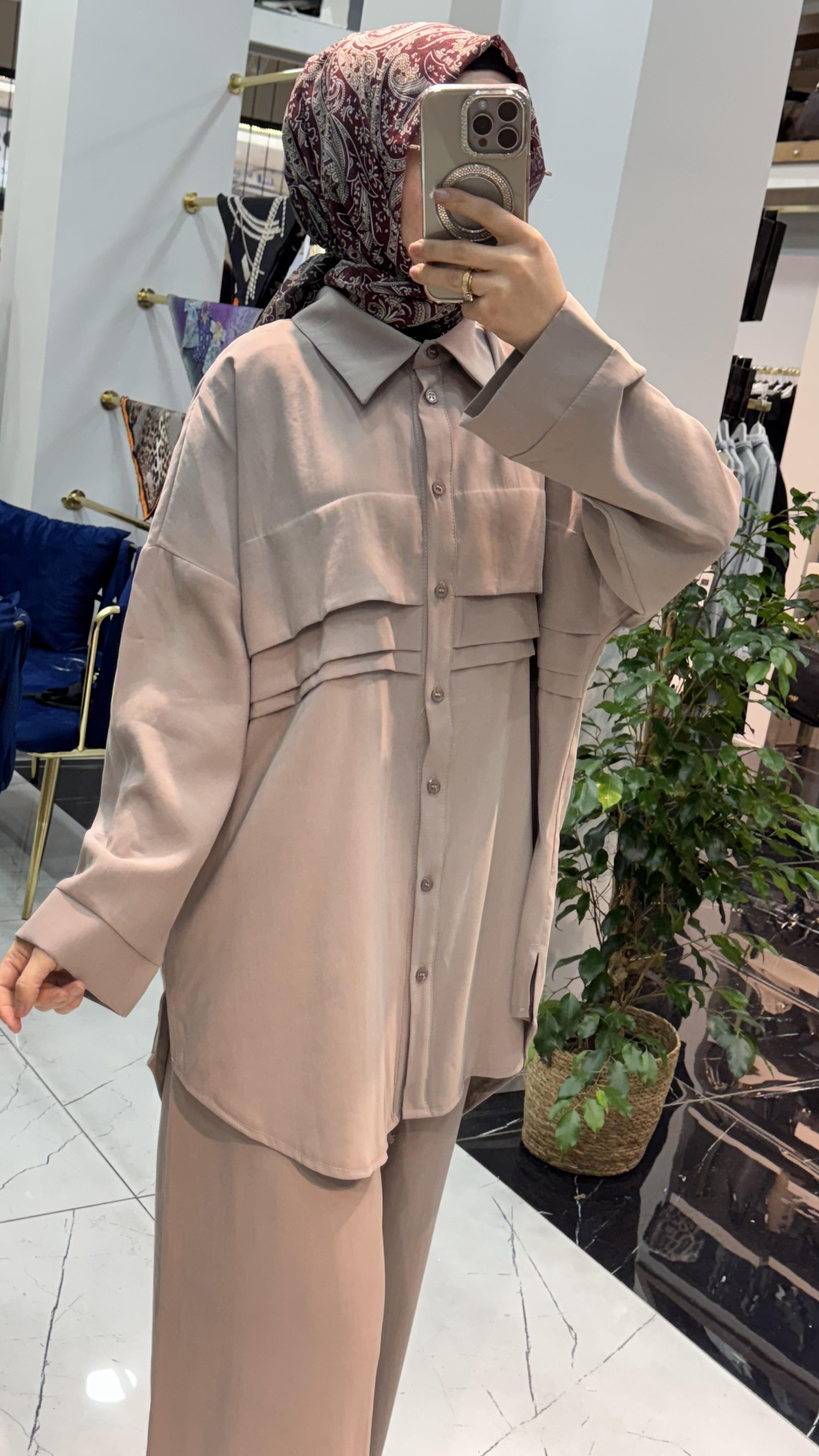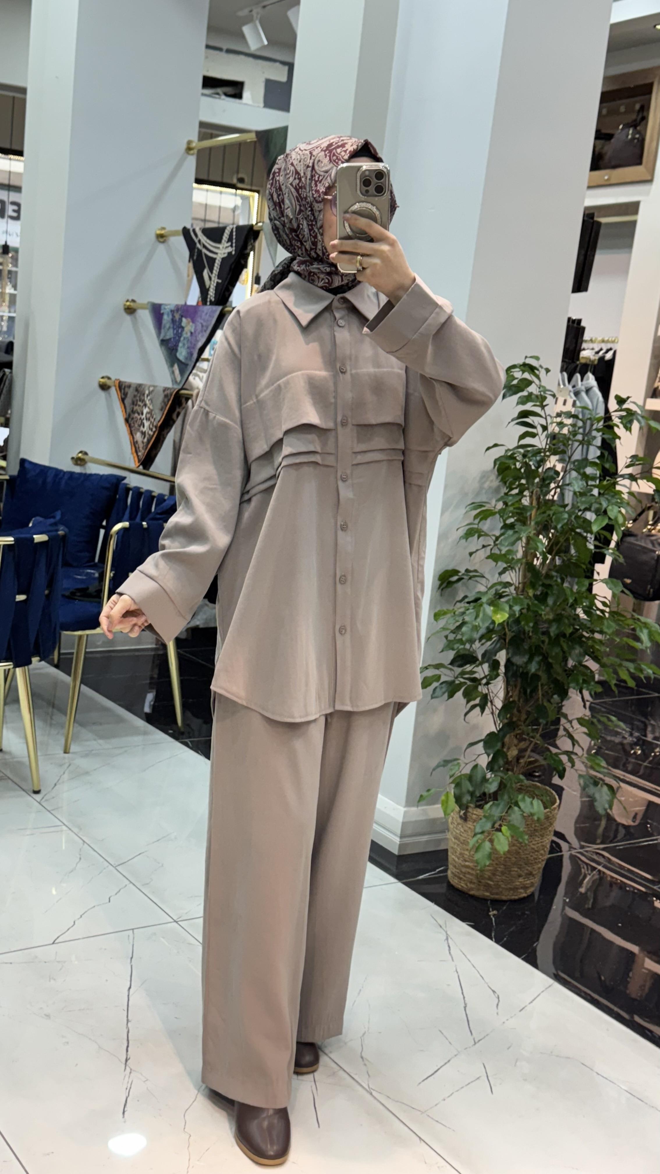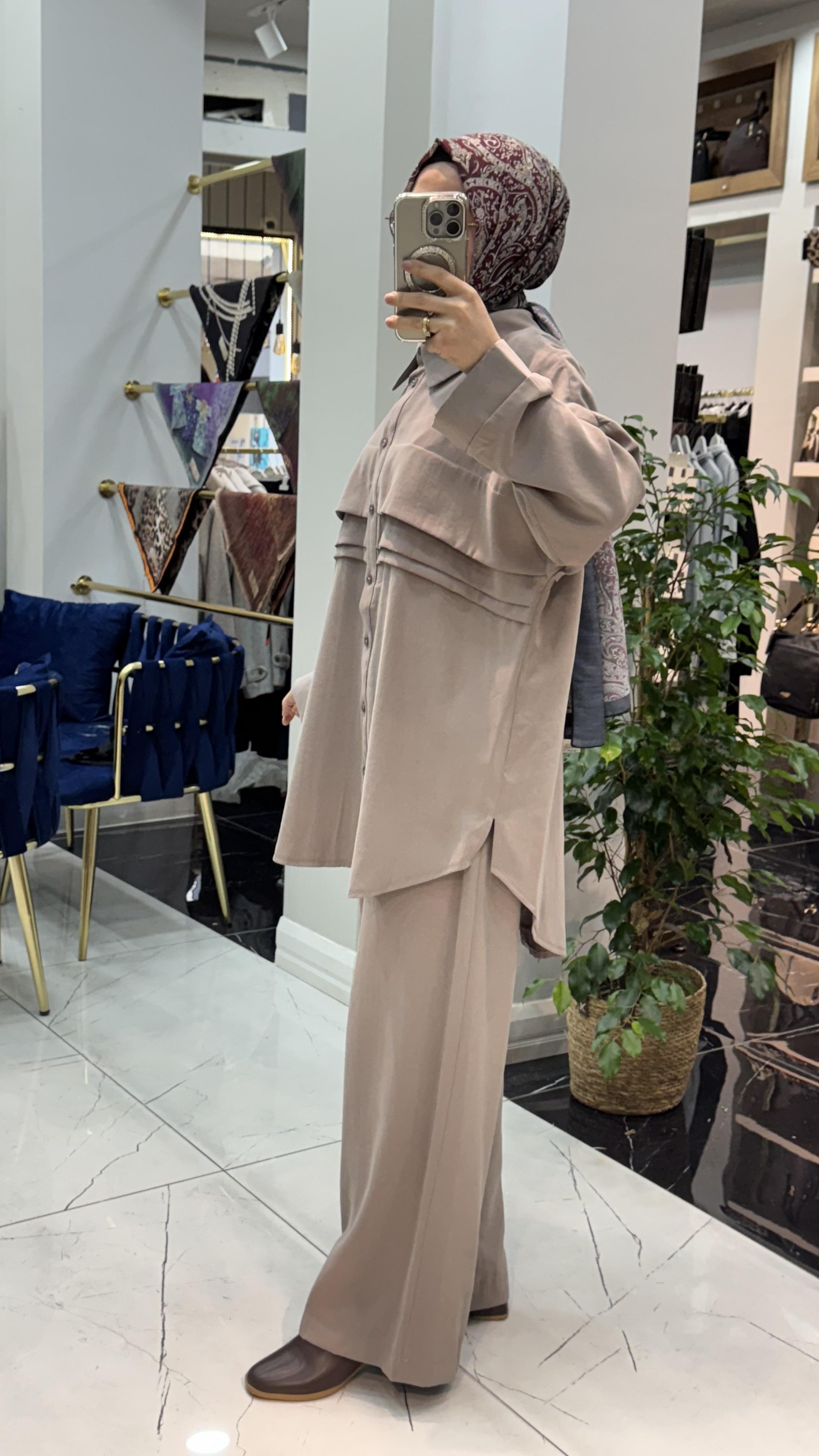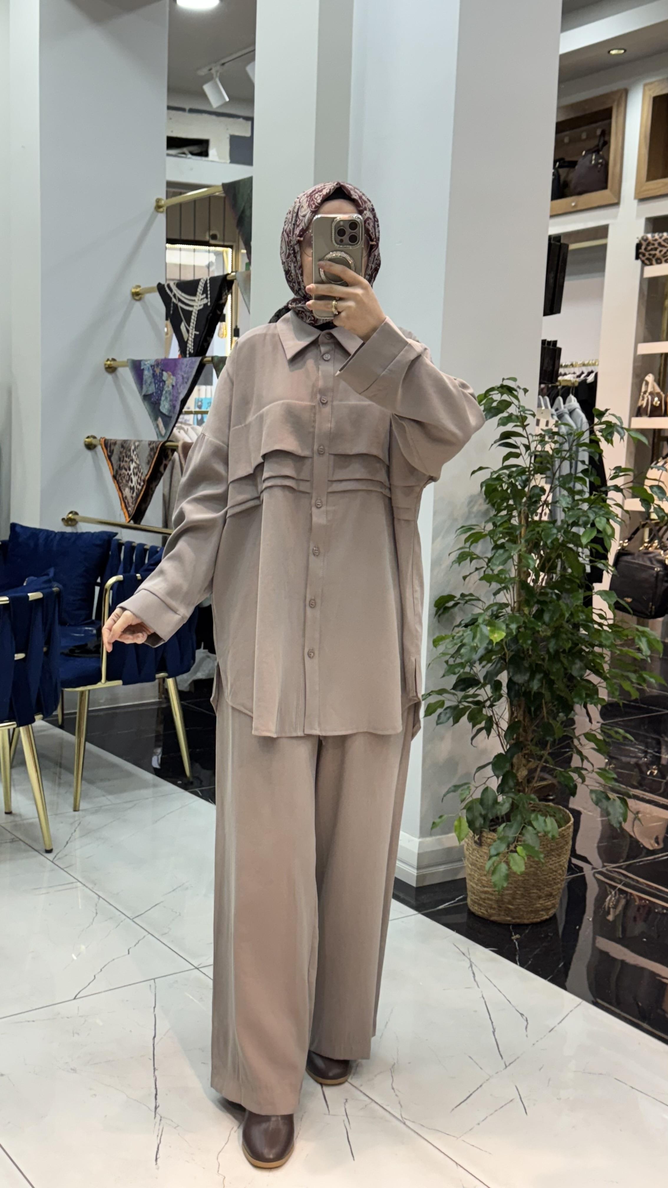 Gömlek form üstü ve bol paça pantolonu ile hem konforlu hem asil bir görünüm sağlar.